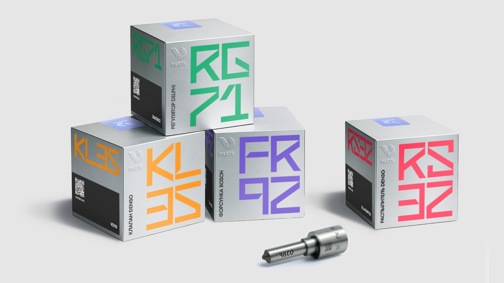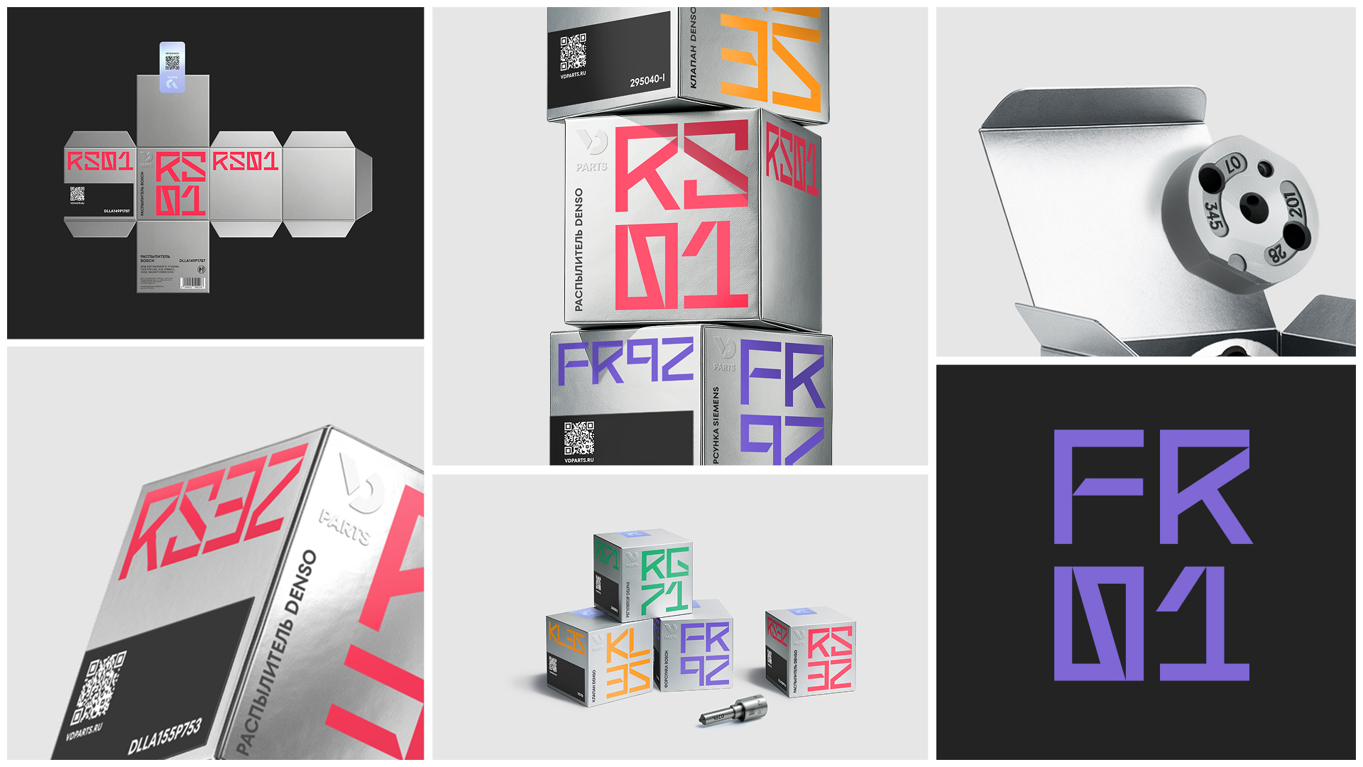 Типографика используется не только как средство навигации, но и как визуальная система, выстраивающая логику на всех уровнях упаковки. Крупные буквенные аббревиатуры обозначают тип изделия, а порядковый номер — его конкретную позицию. Благодаря этому шрифт стал не просто инструментом идентификации, а основой визуального кода VD Parts.